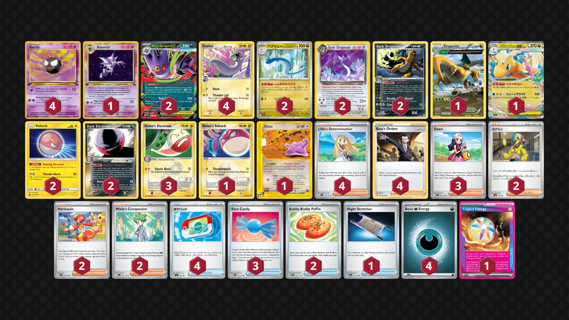 悪エネルギーを山札からつけられるわるいマルマイン、悪エネルギーをつけかえられるわるいカイリュー、悪ポケモンのとられるサイドを少なくできるメガゲンガーexのコンボデッキです。